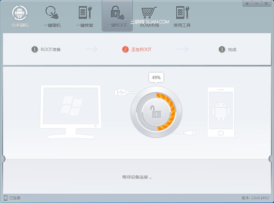 連上手機和電腦,使用完美刷機Root工具為EVO 3D一鍵Root。打開軟件選擇使用一鍵Root功能為HTC G17 獲取到權限。確認連接好設備,點擊一鍵Root。