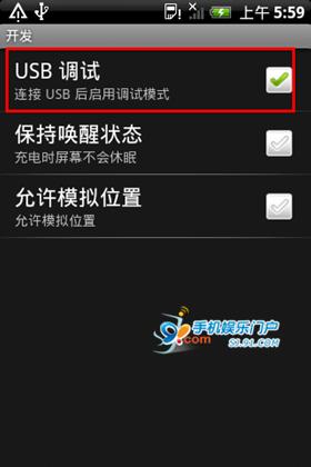 進入“設置”->“應用程序”->“開發”勾選“USB調試程序”。這樣設備才可以通過USB連線時被PC識別到。