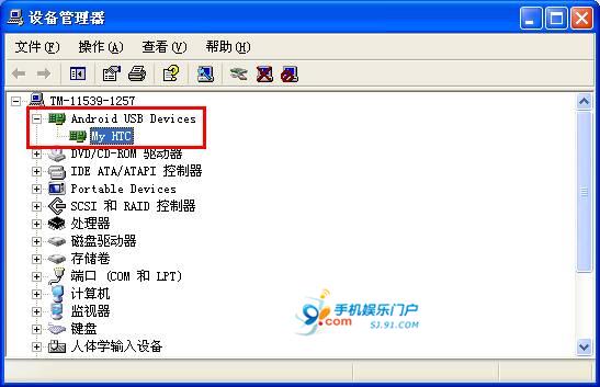 驅動安裝完畢後,就可以看到“設備管理器“中Android USB設備的黃色感歎號已經去掉。