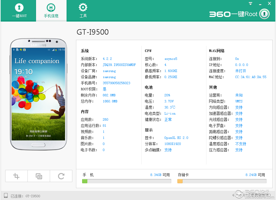 設置好USB調試(打開USB調試教程),使用數據線連接到電腦,等待電腦成功安裝上驅動,當360一鍵ROOT工具識別到你的手機之後,如下圖