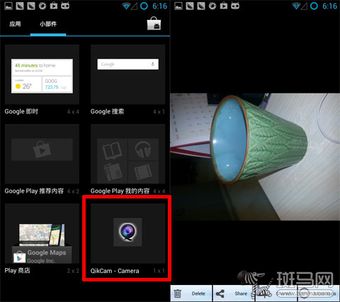 設置好以後點擊SAVE以後,進入安卓系統的桌面小部件菜單,將“QikCam - Camera”放到桌面就可以了。之後直接點擊桌面上的按鈕就可以快速拍照了。
