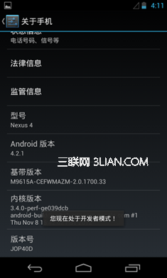 如果您的手機是Android 4.2.X版本,請在設置中找到“關於手機”選項,點開後拉動至頁面最底部的“版本號”連續點擊。