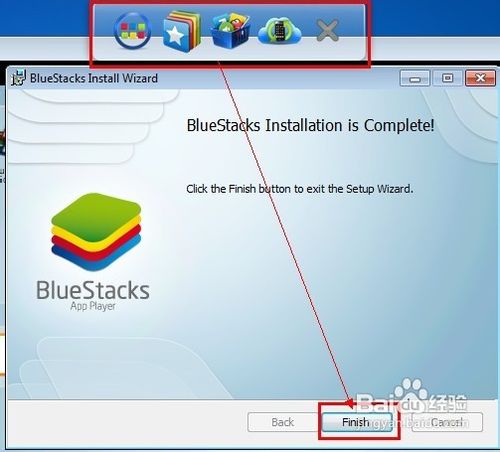 安裝完成後,會自動運行BlueStacks程序,並在屏幕上方顯示快捷工具欄。在安裝界面上單擊“Finish”,退出安裝界面: