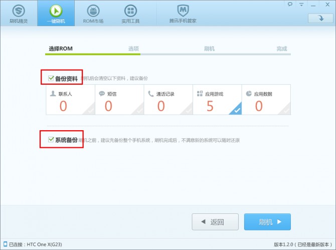 • 在選擇ROM界面勾選系統備份和資料備份,然後點擊刷機,系統會自動對資料及手機系統進行備份