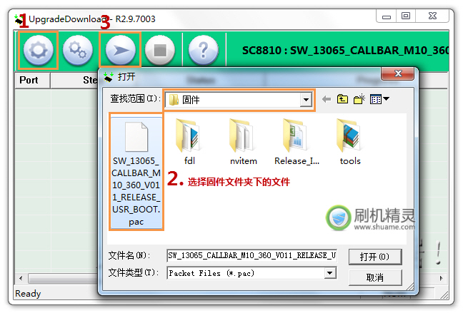 • 運行刷機工具下的 UpgradeDownload.exe 程序,按照下圖設置