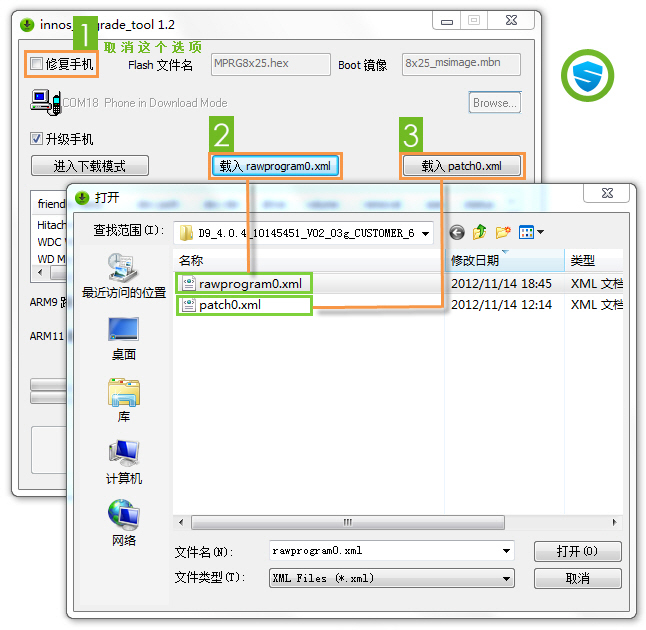• 取消 修復手機 選項,根據手機系統版本號選擇相應的目錄!分別載入 rawprogam0.xml 與 patch0.xml