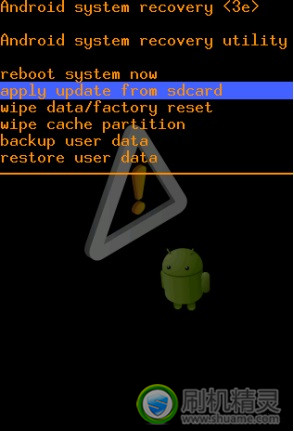 •按音量上下鍵移動,移動至“ apply update from sdcard “,如recovery裡沒有這一項,那就選擇“ apply update from external storage“,按開機鍵進行確認