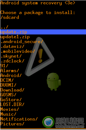 •選擇“update.zip”文件,然後按開機鍵進行確認進行刷機