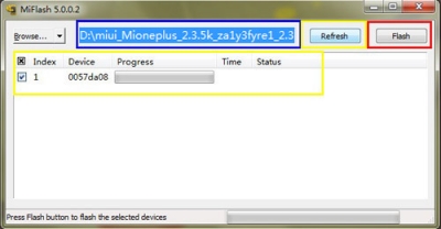• 點擊黃色圈選部分Refresh,刷機程序會自動識別手機,點擊紅色圈選部分Flash開始刷機