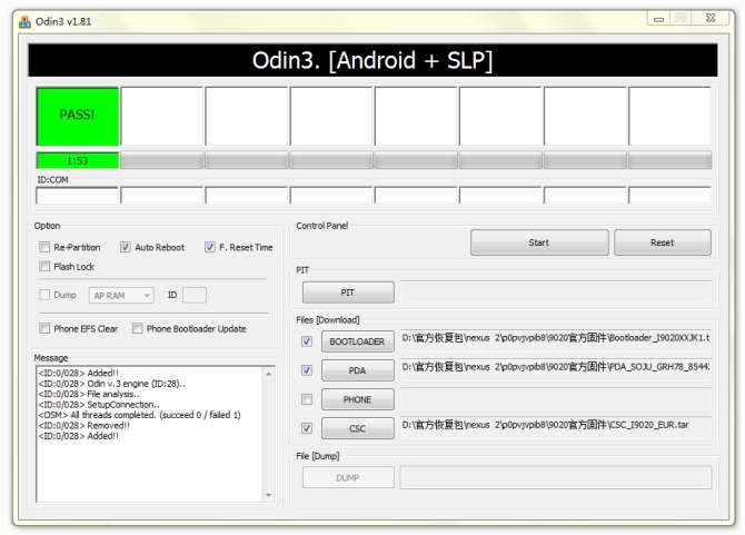 運行刷機工具包內的 Odin3 v1.81.exe 按照橙色框內設置好後, 點擊綠色框內的 Start 開始刷機!