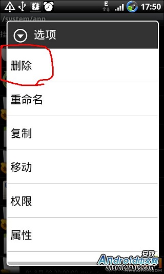 要刪除那個文件,就在該文件上長按,會出現“選項”,選擇“權限”: