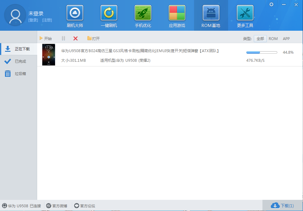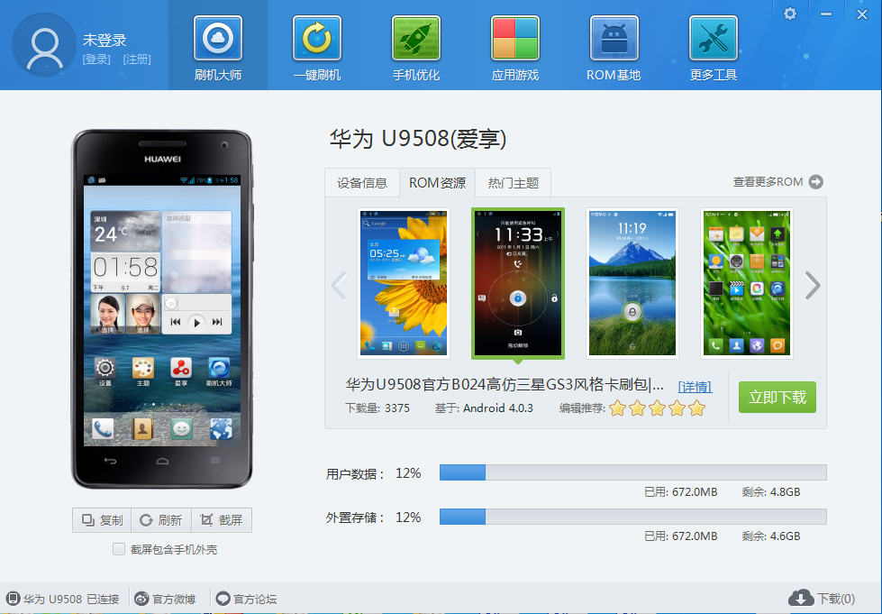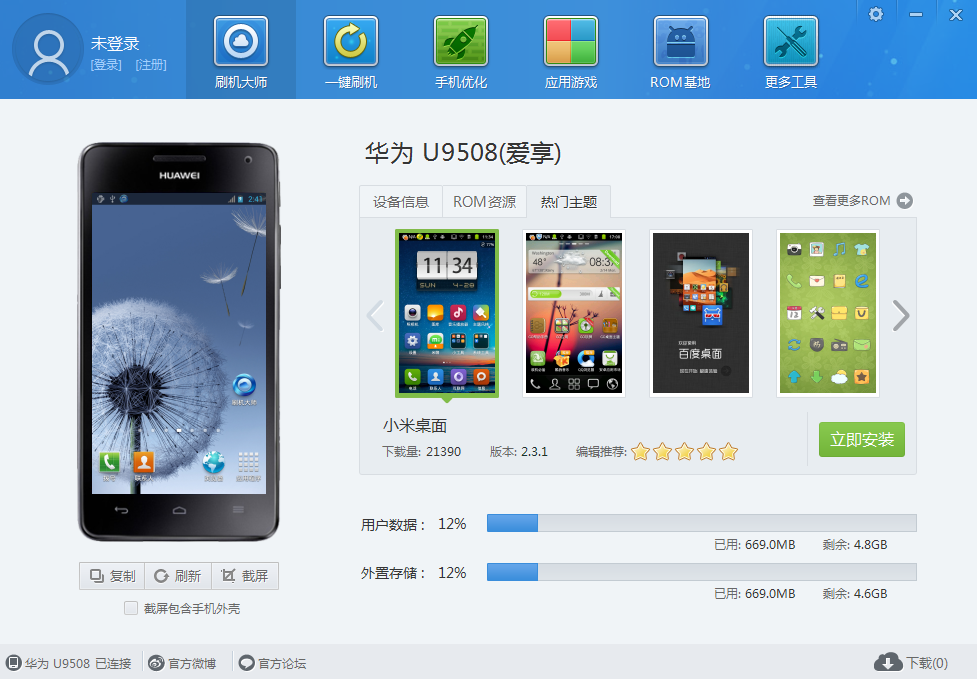 由於安卓手機的先天開放性使得用戶可以DIY一部完全屬於自己的手機,說到這裡,難點就來了,很多用戶不知道該怎麼刷機又或者不知道該如何去選擇一款適合自己的ROM來刷機,還有些用戶當看到繁瑣的刷機教程時便望而卻步了。只要你的手機沒有那麼冷門,都可以輕輕松松實現一鍵刷機,刷機大師內置國內最大的 ROM市場ROM基地,不用再看教程不用再特意去找ROM包,只需輕輕一點,剩下的就交給大師解決吧,