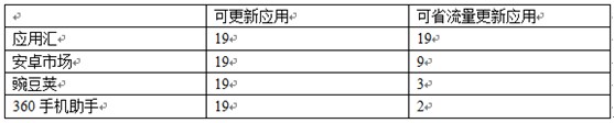 筆者對自己手機裡等待更新的軟件進行了對比,省流量更新功能目前還未能覆蓋全部軟件,不同應用商店的覆蓋范圍不同,同時部分軟件對於手機中有些應用並非是官方安裝包,或者版本跟當前最新版本差距有點大,可能增量升級會不起作用。應用匯覆蓋范圍遠遠超越其他市場遙遙領先.