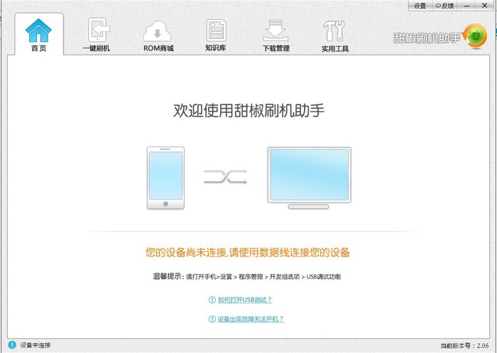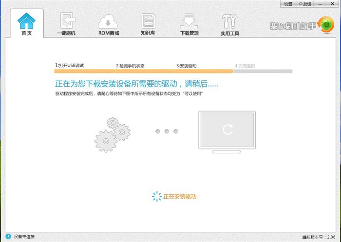 二、將手機與電腦進行連接,進入手機設置-應用程序-開發,開啟USB調試,此時甜椒自動下載安裝適配驅動(若手機沒有動靜,將USB線插入電腦主機後的口上),首頁進入連接狀態,按照電腦提示,選擇自動安裝驅動選項。