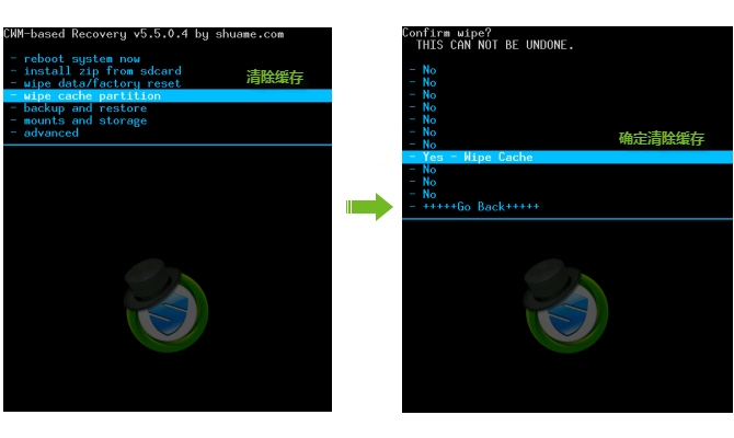 - wipe cache partition 清除緩存 - Yes - Wipe Cache 確定清除緩存