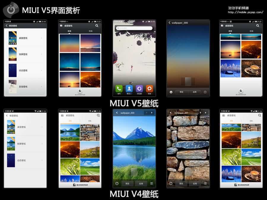 壁紙,一直是很多手機廠商特別看重的功能。MIUI V5系統中的所有默認壁紙與此前MIUI V4全都不同,這種不同不僅僅是圖片不同,而是風格上的差異。雖然兩種照片都是取自於大自然優美的環境,但MIUI V5的風格明顯更加淡雅。對於壁紙,每個人都有不同的喜好,僅從小編個人來說,新系統默認的桌面壁紙比此前V4系統中雪山、草地、河流好太多了。