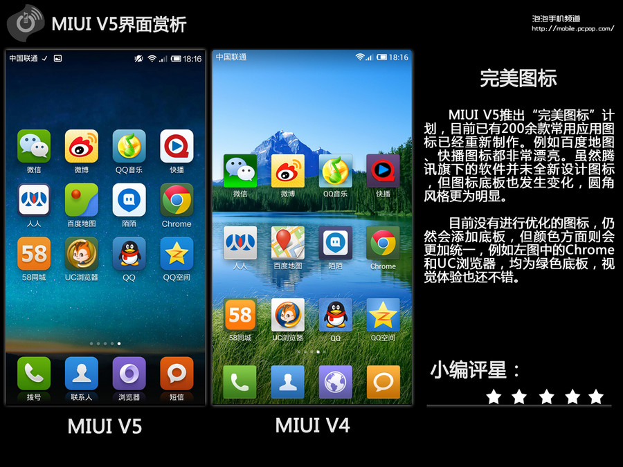 MIUI V5推出“完美圖標”計劃,目前已有200余款常用應用圖標已經重新制作。例如百度地圖、快播圖標都非常漂亮。雖然騰訊旗下的軟件並未全新設計圖標,但圖標底板也發生變化,圓角風格更為明顯。