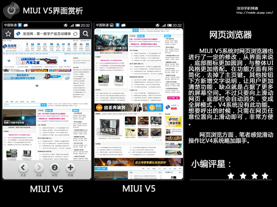 MIUI V5系統對網頁浏覽器也進行了一定的修改,從界面來說,底部圖標更加圓潤,與整體UI風格更加搭配。在功能方面有所簡化,去掉了主頁鍵。其他按鈕下方新增文字說明,讓用戶更加清楚功能,缺點就是占據了更多的屏幕空間。不過只要向上滑動網頁,底部欄會自動消失,變成全屏模式,V4系統沒有此功能。想要呼出的時候,只需在網頁任意位置向上滑動即可,非常方便。