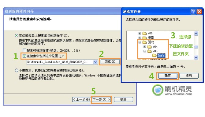 • 勾選 在搜索中包括這個位置 然後點擊 浏覽 選擇所下載的相關 驅動配置文件夾