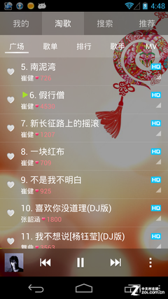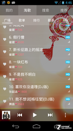 在淘歌菜單中,又分為廣場、歌單、排行、歌手和MV幾大分類,用戶可以根據自己的喜好,通過不同的分類查找自己喜歡的歌。