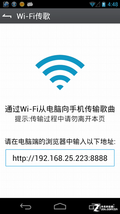 打開Wifi傳歌界面,在電腦中輸入界面上給出的IP地址,浏覽器中就會出現一個傳輸界面,根據屏幕提示很容易就可以完成歌曲傳輸了。