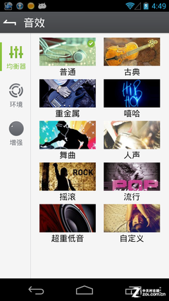 其中,音效功能可以用於調節天天動聽播放器的聲音效果,程序中內置了一些常用音效,包括古典、重金屬、搖滾等等,當然用戶也可以根據自己的喜好進行自定義效果。