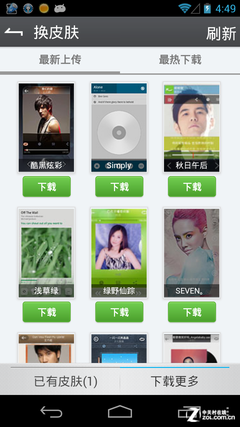 天天動聽的界面也和桌面壁紙一樣,並不是一成不變的,通過換皮膚功能,用戶可以在線下載到很多漂亮的皮膚應用到天天動聽上。