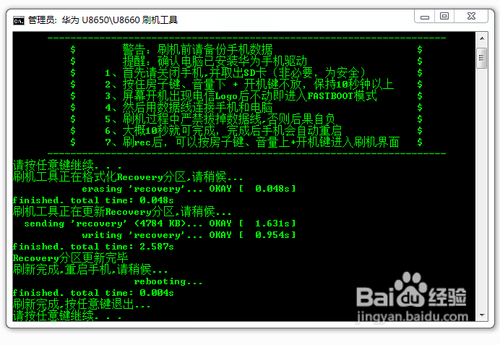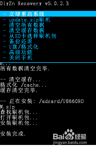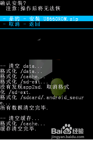 開始執行刷新ROM操作。首先利用音量“上”和“下”鍵選擇“從SD卡選擇數據包”,按“搜索”鍵進入,選擇”從SD卡安裝zip文件“,按“搜索”鍵進入,找到SD卡中的ROM程序(本經驗中ROM程序名稱為“U8660.zip"),然後在彈出的確認界面中按“搜索”鍵確認,之後就開始進行執行刷機操作。
