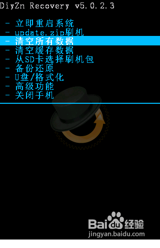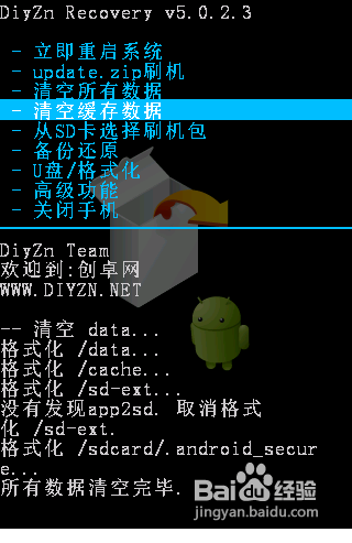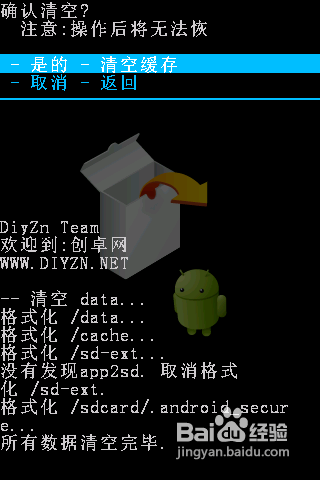 按一下手機上的“返回”鍵,在主界面中用音量“上”和“下”鍵選擇“清空緩存數據”項,在彈出的確定界面中選擇“是的,清空所有數據,然後再按“搜索”鍵確定,以完成手機數據的清理操作。