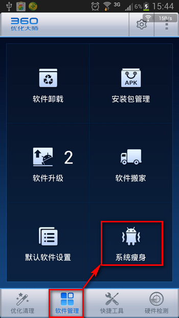 點開軟件,直接在軟件管理-系統瘦身裡面對手機系統軟件進行刪除
