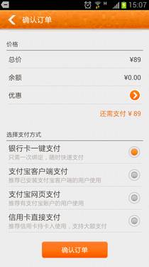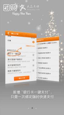 手機團購的確是方便快捷,但是每次在提交訂單後付款時都要輸入一堆數字還是很煩人的事情,點評團購1.2新增的“銀行卡一鍵支付”功能很好的解決了這個問題,用戶只需綁定自己的銀行卡,即可實現快速支付,大大節省的付款時間,用戶體驗得到了很大提升。(目前只支持信用卡)