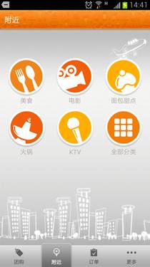 下載更新點評團購1.2之後,在初次使用時會有新功能的信息提示,讓用戶對新功能有一個初步的了解。點評團購1.2的界面風格基本沒有改變,下方的導航菜單的變化最為明顯,加入了附近功能,並將團購券和訂單功能整合在了一起,保持了點評團購界面簡潔美觀的特點。