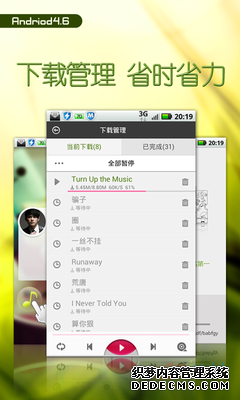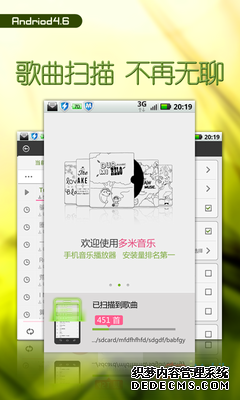 另外,多米音樂借助本次新版的推出,也對其服務的側重點做了改動。從舊版中,對本地和在線雙注重,到這次推出的新版本,對本地模塊做了更大的優化。用戶可以看到,在“❤我”界面新增了“下載管理”,從舊版單曲管理,到新版批量下載,量變的同時還提高了音質效果。Andriod 4.6版本中,多米將掃描界面和引導界面相融合,用戶在掃描歌曲的同時,便可以了解到其新功能。