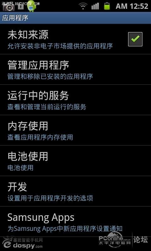 三星I9100點擊設定——應用程序——開發——然後勾選“USB調試”的選項;