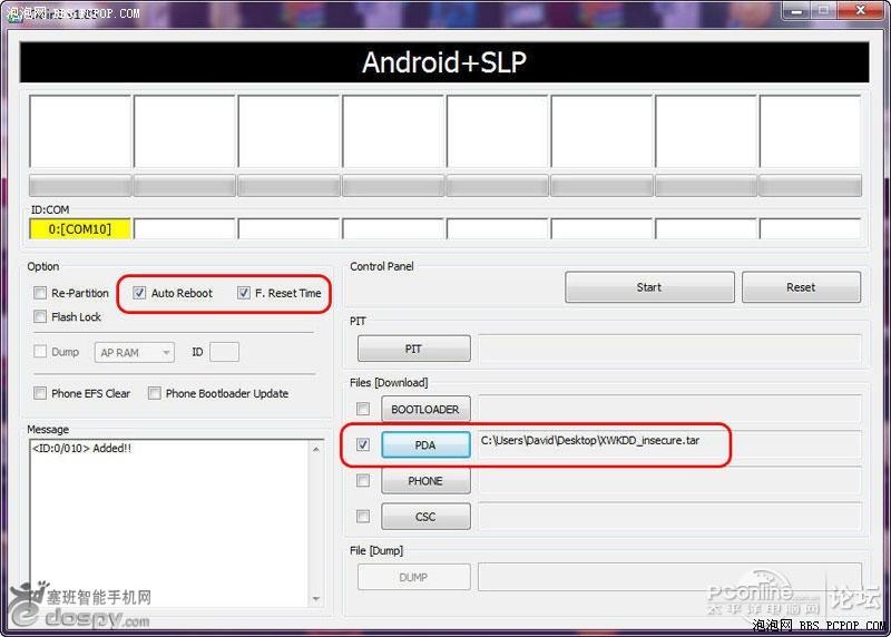 在PDA按鈕前打上勾,然後選擇XWKDD_insecure的壓縮包,並確保只是勾選了“Auto Reboot”、“F.Resrt Time”、“PDA”這三個選項;