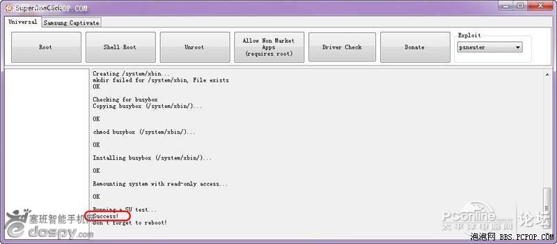 上面那些對話框全部按完之後,主界面會出現“Success”的字樣,這就是標明機器已經三星I9100 root成功了;
