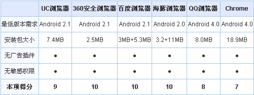 本項測試中360浏覽器有著最低的版本需求,同時安裝包容量也較小,沒有其他不該有的用戶權限,Chrome浏覽器和QQ浏覽器極速版對版本要求太高,同時浏覽器的安裝包也很大,在本項測試中吃虧也很正常。必須說明的是,百度浏覽器和海豚浏覽器都需要另行下載極速內核,已達到功能最大化,使用極速內核會提高浏覽器的容量以及對系統版本的需求,但這種可供選擇的方式值得提倡。
