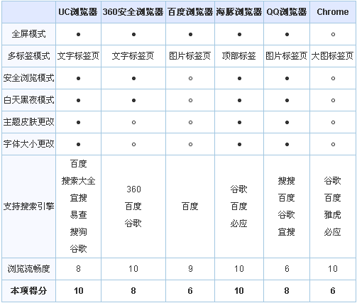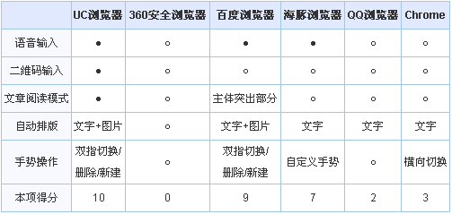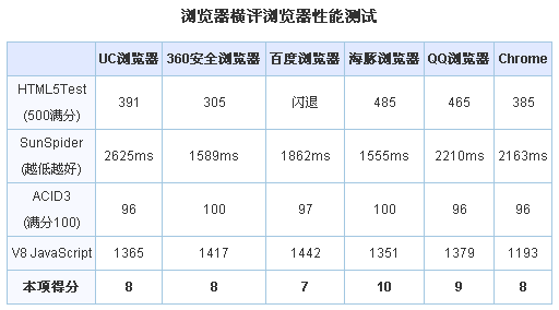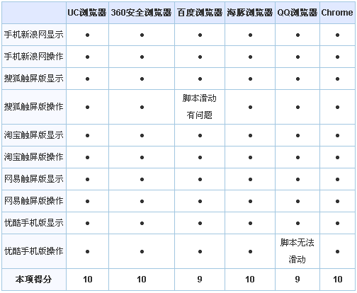 其實除了我們的測試項目外,浏覽器產品大多提供了更多功能,比如新穎的WebApp,快捷的充值功能,但這都超出了浏覽器的范疇,所以我們也沒對這些功能進行測試,再有目前的手機浏覽器還局限於浏覽,本地App在功能上依舊強勢。所以我們的橫評得分也顯得很有參考價值,按照慣例我們將橫評全部的分數進行列表,方便大家查看。