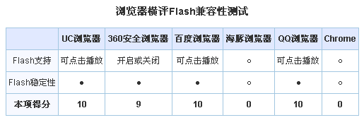 而對於用戶體驗比較重要的一項就是Flash Player,Flash Player已經有Adobe官方聲明稱不支持Android 4.1(Jelly Bean)操作系統,但實際測試發現不支持的僅有Chrome浏覽器,所以Chrome浏覽器在本項測試中要被扣掉10分,在Android 4.1系統中測試Flash Player,我們主要測試的是視頻播放,這也是Flash插件目前最大的用途,主要考驗的是浏覽器對於Flash Player的兼容情況,是否可以流暢播放,而不出現兼容性問題,我們對各款浏覽器進行了3輪Flash播放的兼容性測試,結果如下表。