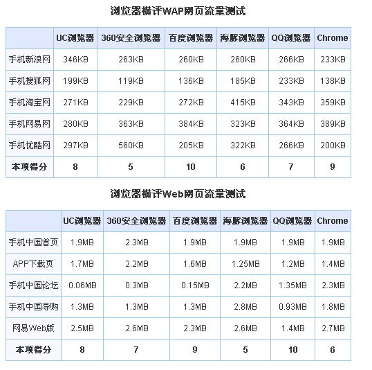從流量測試中我們看出,目前手機的省流量功能都還差不多,分數的座次我們也是按照流量倒敘來拍的,百度浏覽器在此項測試中表現優異,如果對流量非常關心的朋友,那麼使用百度浏覽器絕對是一個好選擇。當然,前幾名的流量差距並不大,但由於給分方法的原因,所以得到的分數差距比較大。從中我們也可以看出觸屏版網頁相對於Web版網頁加載流量方面控制得相當出色,推薦用戶使用觸屏版網頁。