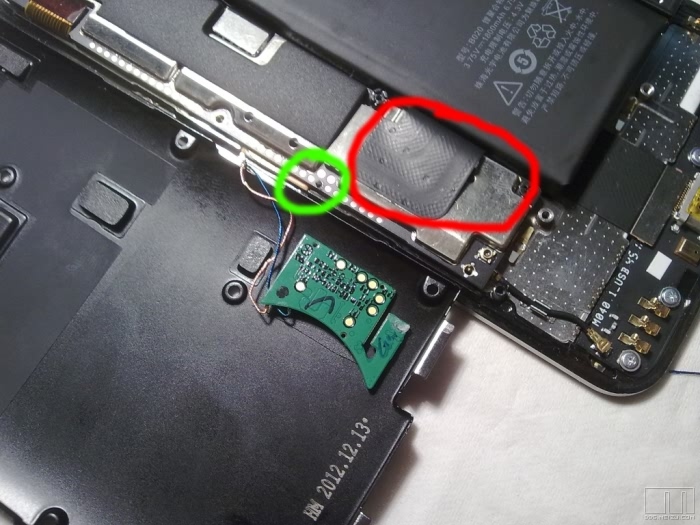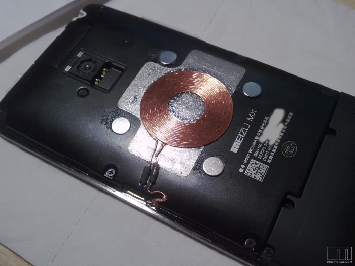 建議把線圈固定在中間偏下的位置(偏上容易造成改造後MX2無法完全貼合在石頭上,我這個裝的位置就有些偏上了,懶得改了),線圈通過漆包線延長,由鐵殼SIM卡處引入主機內部(這個地方縫隙較大,不會卡到線)特別注意那四個定位用的金屬片,一定要嚴格按照原裝的位置進行擺放,切記,切記。