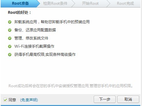 2.點擊一鍵root,勾選同意《免責聲明》點擊下一步