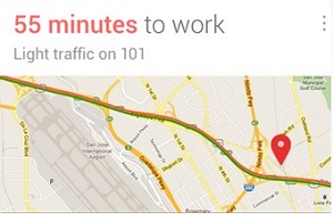 Google 能夠“監視”你的任何地理位置變化並記錄你在某個地點滯留的時間,經過簡單的學習或者用戶設置,Google Now 能在早上給出上班路線和所需時間,在傍晚之後給出當前地點回家的時間和路線。另外,Google 還檢測你經常逗留的其他地點。由於我平時經常去女友那裡,Google 也會在適當的時候提示我多去看看女朋友(^_^)。如果你在日歷中設置了帶有地點的事件,也會在事件開始一定時間前(取決於交通狀況)提醒你趕去那個地點。