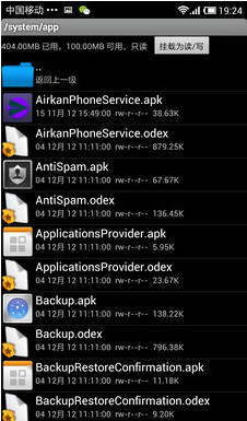 讓RE管理器獲得ROOT權限,(注意這個問題我在1S上面就有發現,有時候會沒辦法獲得ROOT權限的,這時就得重啟,但ROOT臨時權限又沒有了,就得重新安裝LBESEC_MIUI.apk,就這樣,一般情況下重啟一二次就可以了.有時也得3,5次,反正肯定能讓RE獲得權限.接下來就是用RE打開system/app/進到這裡面後把屬性改成讀寫,如圖