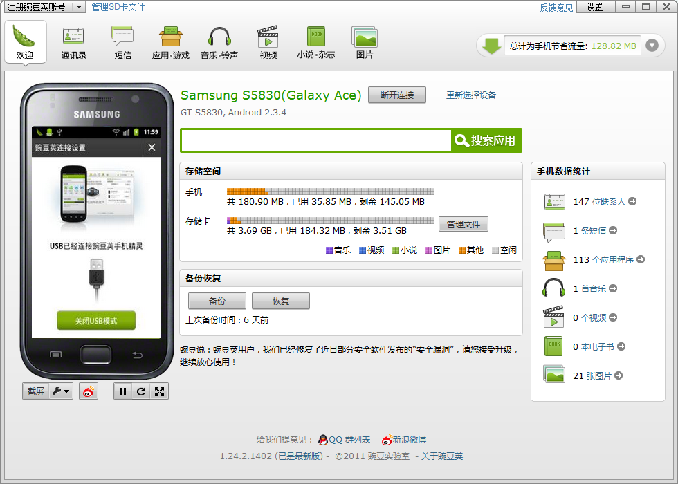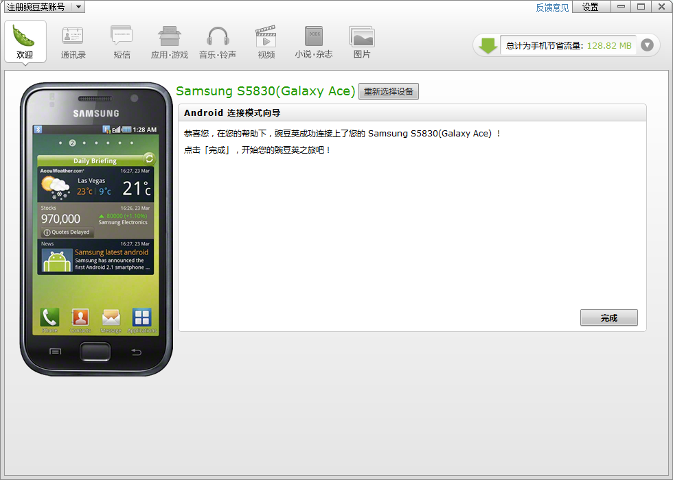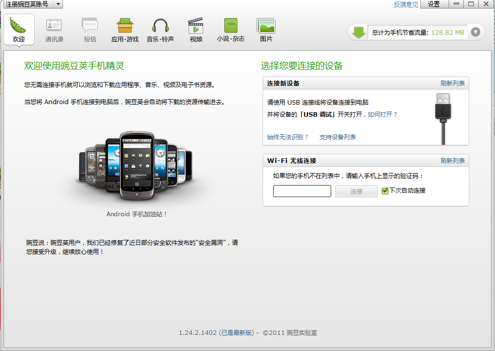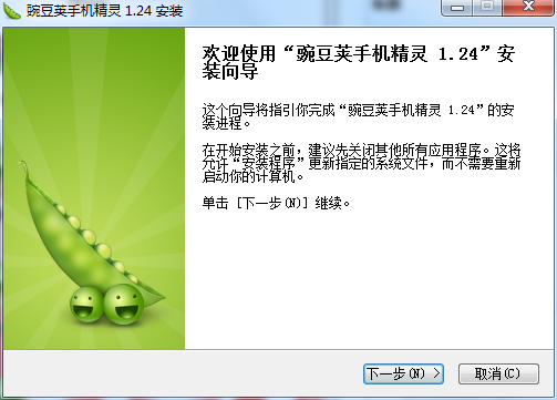 2、解壓豌豆莢手機精靈最新版並安裝裡面的WanDouJiaSetup_v1.24.2.exe,同樣是一直點“下一步”直到完成,此時進入豌豆莢手機助手界面。
