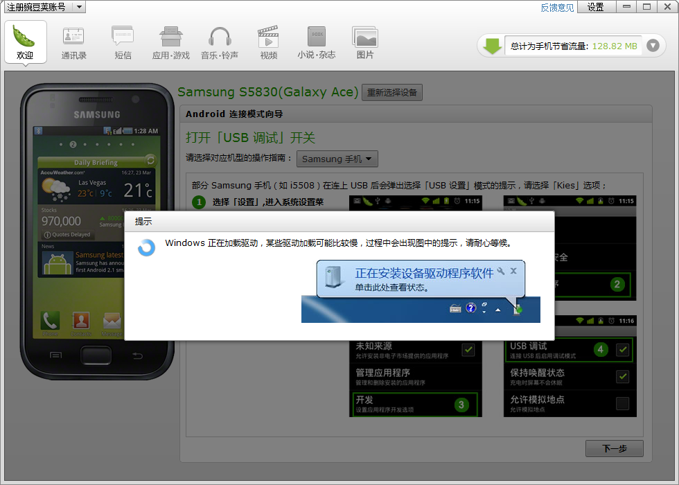 3、把你的手機連上電腦,第一次連接電腦豌豆莢會出現如下界面,稍等片刻後就會出現。