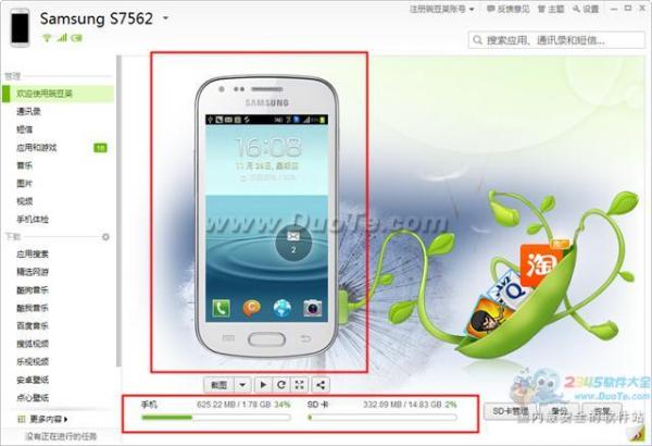 將手機通過USB接口連接到電腦上,豌豆莢將自動檢測你的手機,並進行連接。如下圖: