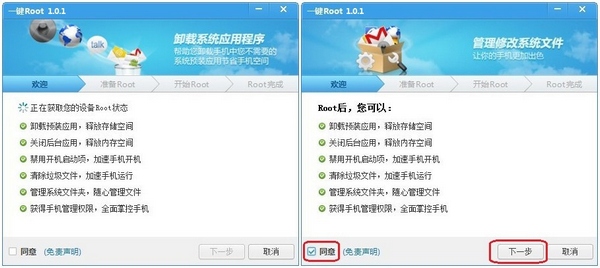 二、系統會獲取您的設備Root狀態,獲取成功後會先提醒您Root之後的作用,勾選【同意】點擊【下一步】: