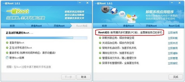 四、靜靜等待1~3分鐘,Root過程便完成了!記得:這個過程千萬不要斷開手機連接,Root完成之後,你就可以全面掌控自己的手機了!