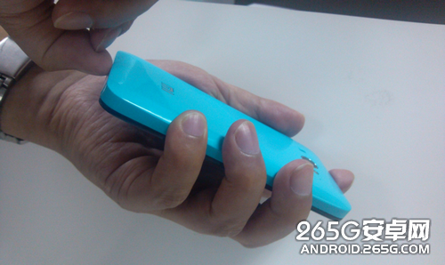 如下圖,同樣,第一,沒有力的支點,右手使不上勁。第二,左手按住了上蓋和下蓋的結合部。這時左手給手機蓋的阻力遠遠大於右手開蓋的力。同樣,後蓋也很難打開。